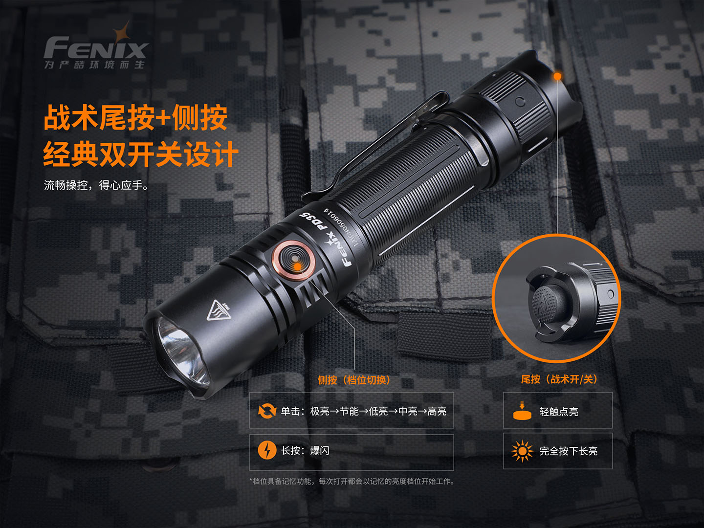 PD35 V3.0采用了一触即亮的战术开关设计,灯具放在包里时可能会因为挤压而误点亮。如果希望避免此问题,您可以在把灯具装入包中前,通过旋松尾盖、或者将电池从灯具中取出。
