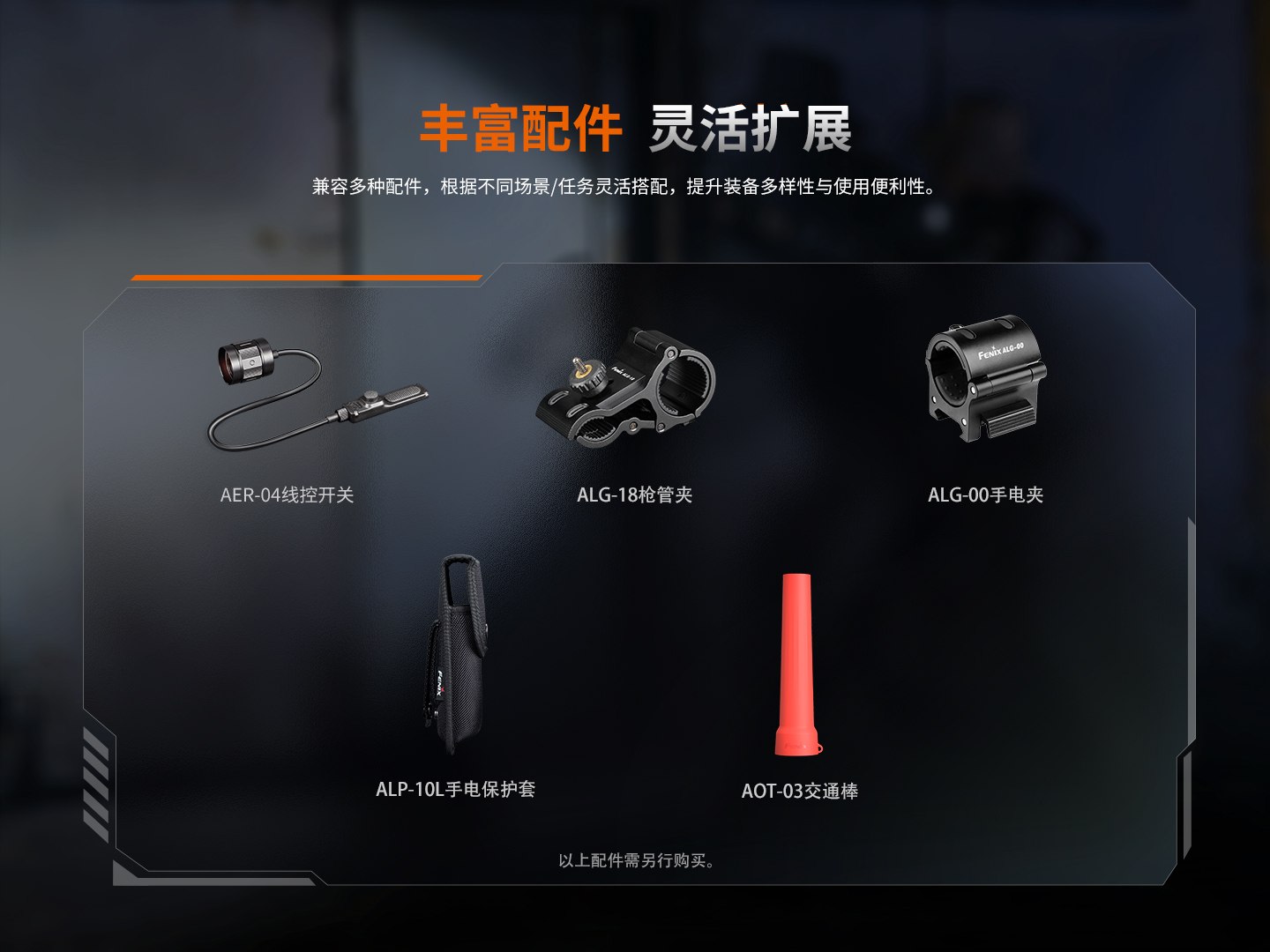 答:AER-04线控开关、ALG-00手电夹、ALG-18枪管夹、ALP-10S手电保护套、AOD-S V2.0柔光罩、AOT-03交通棒等。
